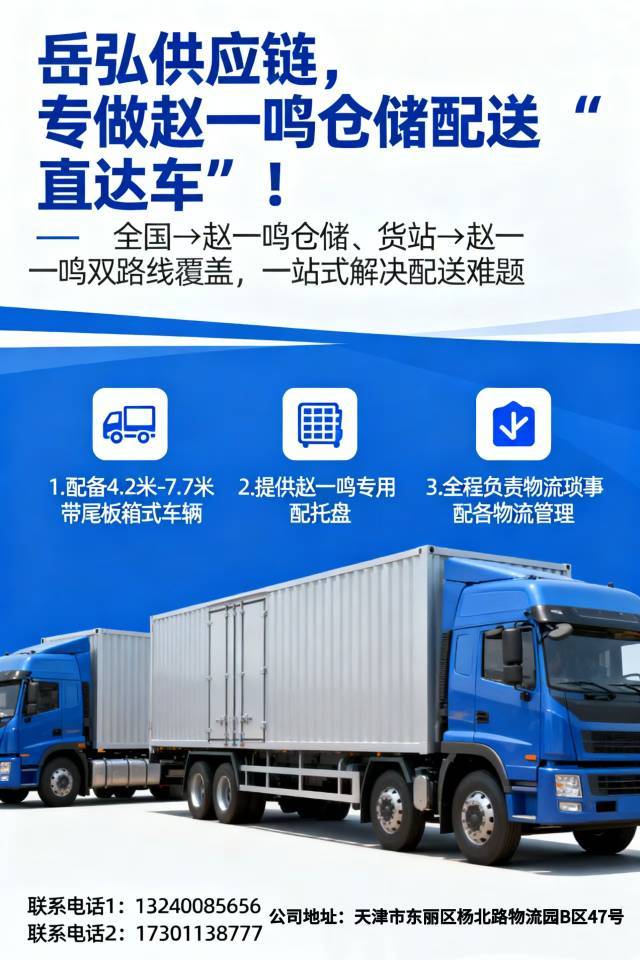 岳弘供应链,专做赵一鸣仓储配送“直达车”!全国货源可直达天津赵一鸣仓储,货站货物也能精准对接配送,全链路打通,让你的货物高效触达,省心更省时。找赵一鸣配送合作伙伴?岳弘供应链是优选!全国→天津赵一鸣仓储、货站→赵一鸣双路线覆盖,无需多方对接,一站式解决配送难题。公...